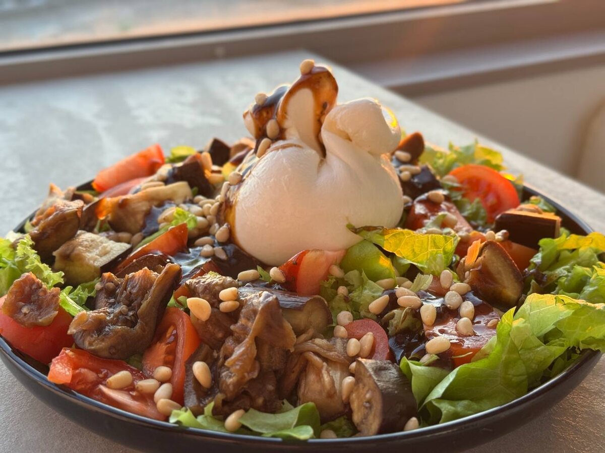 Салат с запеченным баклажаном и бурратой Попробуйте это идеальное сочетание нежности и насыщенного вкуса! Авторская заправка