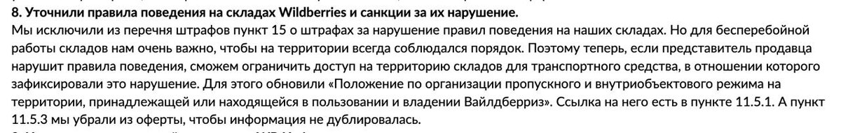 Wildberries убрал штрафы за поведение на складе Хорошие новости: WB исключил пункт 15 из оферты — больше не будет штрафовать за нарушение правил поведения на своих складах. 🎉 Теперь, если ваш водитель что-то нарушил — например, нахамил, закурил или въехал не туда — штрафа не будет. Но важно: WB оставляет за собой право ограничить доступ на территорию складов для транспорта, представитель которого нарушил порядок. То есть, если косяк зафиксируют, водитель может больше туда не попасть. Но, по крайней мере, деньги с селлера списывать не будут. Теперь всё это регулируется не через штрафы, а через пропускной режим, описанный в новом документе: «Положение по организации пропускного и внутриобъектового режима...» Итог: Минус один штраф — уже повод порадоваться. Но не расслабляйтесь: если ваш водитель будет устраивать цирк, WB просто запретит ему въезд. Инструктаж по-прежнему обязателен. Marketplace_biz - отдай свой буст каналу