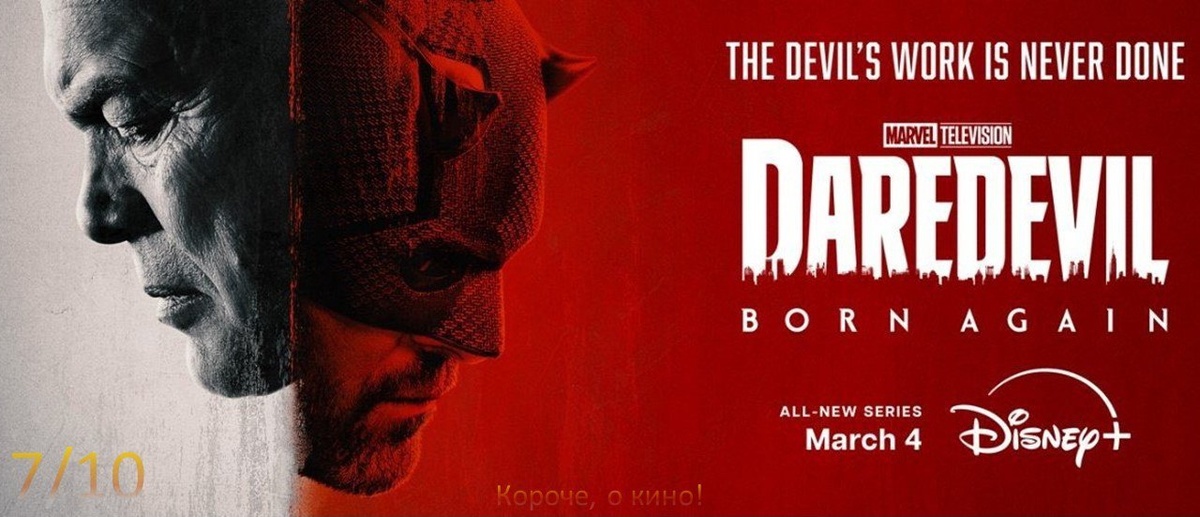 Сорвиголова. Рождённый заново/Daredevil. Born Again 2025–… Перезапуск и продолжение одного из самых успешных сериалов Marvel, выходившего на Netflix Мэтт Мёрдок принимает решение «завязать» с карьерой Сорвиголовы, сфокусировавшись на адвокатской практике и юридической помощи людям. Но Уилсон Фиск становится мэром Нью-Йорка, а на его улицах буйствует серийный убийца Подробно. Короче: Сюжет: 7/10 Игра актёров: 8/10 Экшн: 7/10 Драма: 7/10 Детектив: 6/10 Спецэффекты: 7/10 Оценка КП/IMDb: 7,4/8,1 Общая оценка: Можно посмотреть, даже если есть выбор! #score7 #action #crime #Marvel #fantasy #series