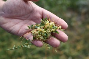 Фото с сайта Федеральной службы по ветеринарному и фитосанитарному надзору по Ростовской, Волгоградской и Астраханской областям и Республике Калмыкия В связи с обнаружением повилики на территории Мишкинского сельского поселения региональным Управлением Россельхознадзора введен карантинный фитосанитарный режим и установлена карантинная фитосанитарная зона. Для борьбы с карантинным объектом утверждена программа локализации очага и ликвидации популяции. В связи с введенным карантинным фитосанитарным режимом, устанавливается перечень ограничений в отношении подкарантинных объектов. На земельном участке, где выявлены очаги карантинного объекта (повилики полевой) вводятся определенные запреты и ограничения. В частности, запрещается вывоз и реализация подкарантинной продукции, выращенной и переработанной в очаге, без карантинного сертификата, подтверждающего отсутствие в продукции живых семян повилики, подтвержденного лабораторными исследованиям а также использование территории очага для выра
