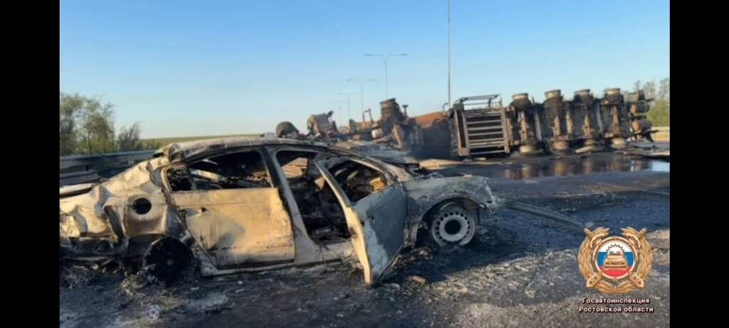 — По предварительным данным, водитель грузового автомобиля «Мерседес Актрос» в составе автопоезда с полуприцепом-цистерной, двигавшийся в направлении города Ростова-на-Дону, допустил наезд на барьерное ограждение с правой стороны. После этого произошло опрокидывание автомобиля с последующим выездом через центральное межбарьерное ограждение на полосу встречного движения, где произошло столкновение с тремя легковыми автомобилями «Пежо Боксер», «Фольксваген Пассат» и «Лада Веста», движущимися во встречном направлении, — сообщили в областной Госавтоинспекции. В результате ДТП произошло опрокидывание битумовоза и возгорание разлившегося битума. Пожар ликвидирован на площади 600 кв.м. К ликвидации последствий ДТП привлекались 36 человек и 14 единиц техники. На месте погибло 4 человека: водитель грузового автомобиля «Мерседес»; водитель с двумя пассажирами, среди которых один несовершеннолетний, автомобиля «Фольксваген». Были доставлены в медицинское учреждение города Шахты шесть пострадавших