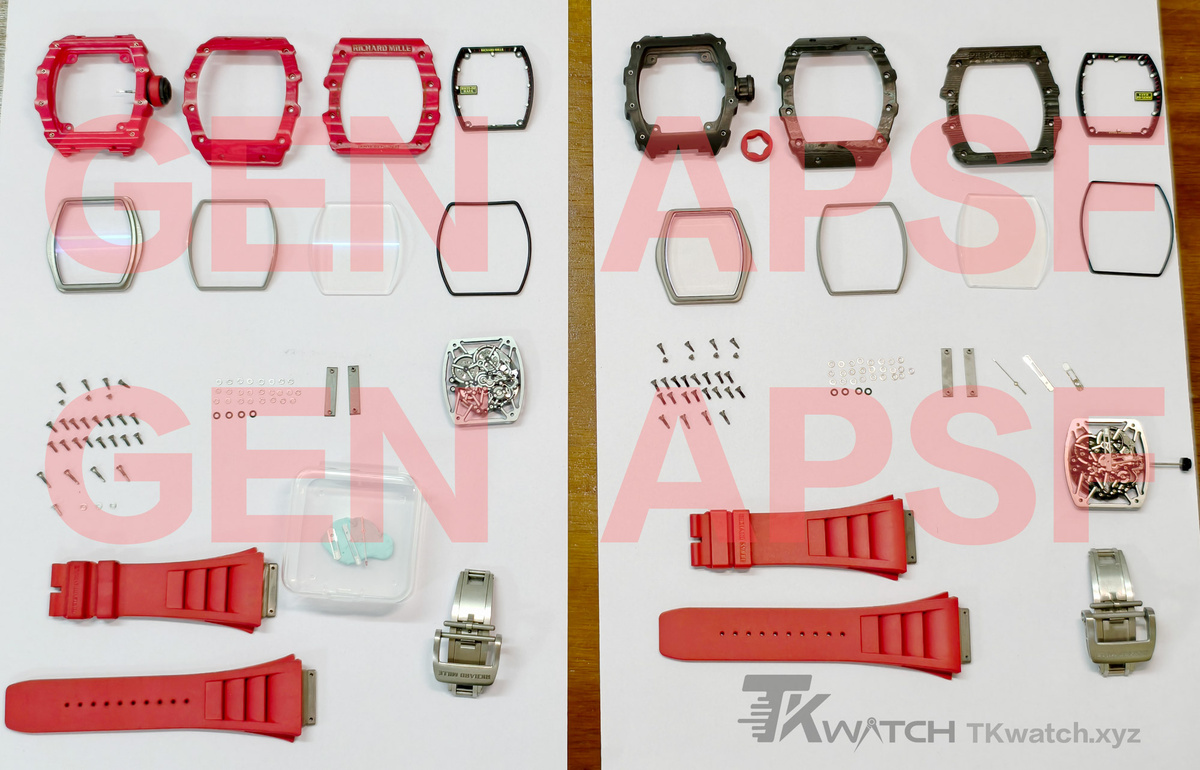 Это первое в истории сравнение оригинальных часов RM (Richard Mille) с клоном. В наши дни многие часы с маркировкой 1:1 не являются таковыми в полном смысле этого слова, но эти 35-02 — настоящая клон 1:1. В статье полный разбор оригинальных часов Richard Mille, так и клона Richard Mille от фабрики APSF: оригинальные слева, APSF справа. Это все компоненты RM35-02, за исключением механизма. Корпус имеет "сэндвич-структуру", а форма и конструкция среднего корпуса точно воспроизведены в масштабе 1:1. Форма корпуса также была идеально воспроизведена. В отсутствие возможности разобрать оригинальные часы большинство представленных на рынке версий основаны на пропорциях, взятых с фотографий, и догадках. Внутри корпуса предусмотрены специальные винтовые втулки. Многие представленные на рынке продукты, заявленные как «1:1», на самом деле не содержат этот компонент — они просто просверливают отверстия непосредственно в цельном куске углеродного волокна. Форма корпуса и конструкция концов ремешка