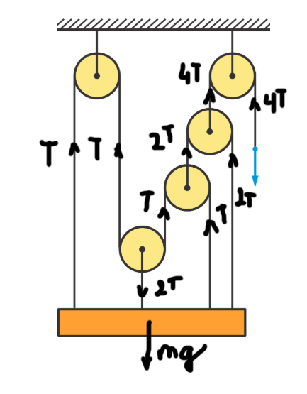 Какой выигрыш в силе даёт система из идеальных блоков и нитей, указанная на рисунке? Ответ округлите до сотых. Груз тянет вверх сила F1=Т+2Т+Т+2Т На выходе сила F2=4Т=mg F2=6T=F2*1.5 Ответ 1.5 Система, состоящая из двух подвижных и двух неподвижных блоков, а также груза массы M=10 кг, находится в равновесии, как показано на рисунке. Массы всех блоков одинаковы и равны m=1 кг. Определите силу натяжения нити в точке A. Ответ дайте в Н, округлив до целого числа. Нити идеальны, трением в оси блоков можно пренебречь. Ускорение свободного падения g=10 Н/кг. Верхние блоки неподвижные. Нитка одна, поэтому её натяжение во всех точках одинаково и равно Т. Масса двух верхних блоков ни на что не влияет (потому что они неподвижные). Объединим в систему груз и 2 нижних блока. Она будет весить 120Н и тянуть вверх её будет сила 5Т. Т=120:5=24Н Ответ 24 Остальные задачи раздела