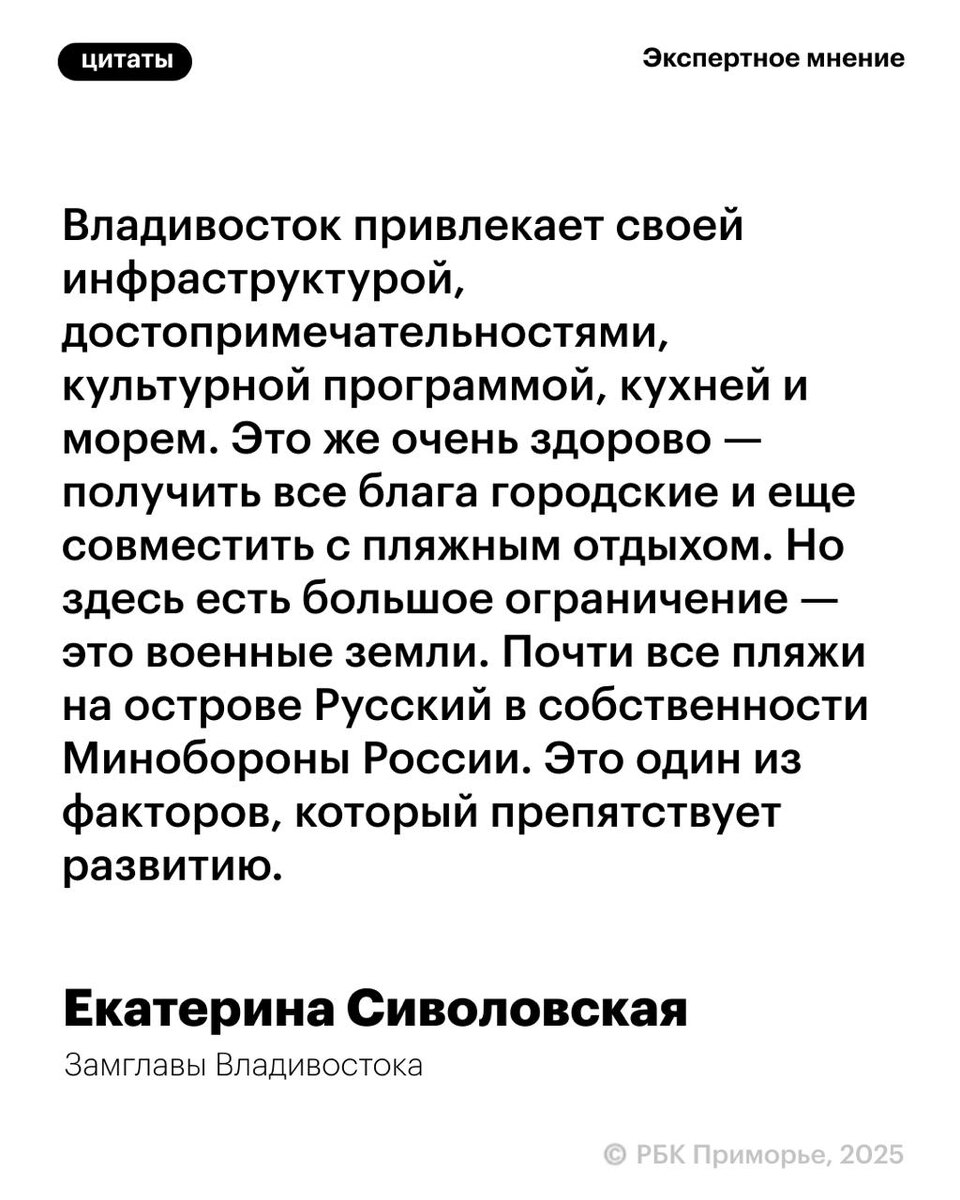😀😀😀 Туристической отрасли Владивостока необходимо снять «военные барьеры», чтобы к 2030 году турпоток в городе превысил 5 млн человек Об этом РБК Приморье рассказала замглавы мэрии столицы ДФО Екатерина Сиволовская. Она отметила, что только на Русском острове почти все пляжи находятся в собственности Минобороны РФ: это мешает благоустройству территорий и развитию там коммерческой деятельности. «Но мы делаем все, чтобы картина изменилась, думаю, в следующем году у нас это получится, чтобы пребывание на островной территории для наших гостей было комфортным», — сообщила замглавы. 😃Подписывайтесь на РБК Восток