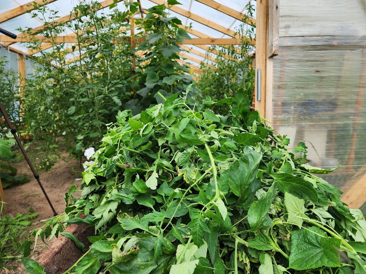 Привет, друзья. Сегодня рано утром пошла поработать в теплице. Работаю рано утром, чтобы слепни меня не покусали, поскольку их очень много. А томаты нужно дальше продолжать формировать. Сейчас важно убрать пасынки и лишние листья. Работы у теплице регулярно провожу. Но пока убирала пасынки со 2-4 грядке, на й грядке томаты уже начали зарастать. На первой грядке в моей большой теплице растут томаты из советских семян, которые мне удалось сохранить. Стоит отметить, что в этом году они очень активно идут в рост и даже опережают гибриды. Кусты доросли до 2,5 метров. И несмотря на то, что регулярно убираю пасынки, у некоторых кустов уже выросли длинные боковые побеги. Поэтому убрала все пасынки у кустов томатов. Это значительно проредило кусты. А также важно то, что растения теперь не тратят силы и питание на их рост. Также обрезала листья так, чтобы над кистью и под кистью были листья. Так поступает питание к плодам и влияет на их рост и созревание. Еще некоторые листья укоротила, чтобы