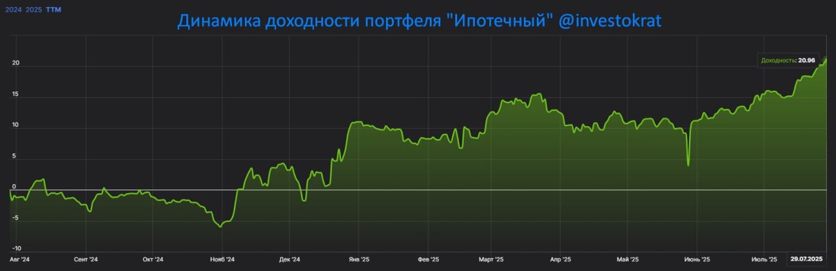 Пока все внимательно следят за геополитикой и возможными санкциями, консервативные инвесторы наслаждаются ростом своих портфелей в период данной турбулентности. Трамп, как я неоднократно писал, личность очень непредсказуемая, он говорит одно, делает другое, а думает третье. И в таких условиях ставить все на "зеро" (акции), как минимум, рискованно. Должна быть определенная доля консервативных инструментов, тем более на цикле снижения ключевой ставки. 💼 Поэтому я продолжаю формировать свой консервативный портфель, который денежным потоком гасит одну ипотеку на 100% и вторую ипотеку на 70%. Еще немного и можно будет вообще не думать о ежемесячных платежах банкам. Во вчерашнем большом вебинаре для нашего клуба (запись уже доступна) я детально разобрал список активов (облигации, ЗПИФы недвижимости, акции), которые держу в ипотечном портфеле и активно докупаю, а также его пропорции. 📈 За последние 12 месяцев доходность портфеля (с учетом всех полученных выплат) почти достигла 21% годовых