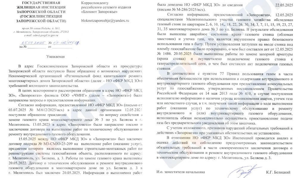 Якобы аварийная служба Некоммерческой организации «Региональный фонд капитального ремонта многоквартирных домов Запорожской области» (НО «ФКР МКД ЗО») якобы не решала проблему жителей, а, лишь перекладывала ответственность на старшего по дому и службу горгаза.