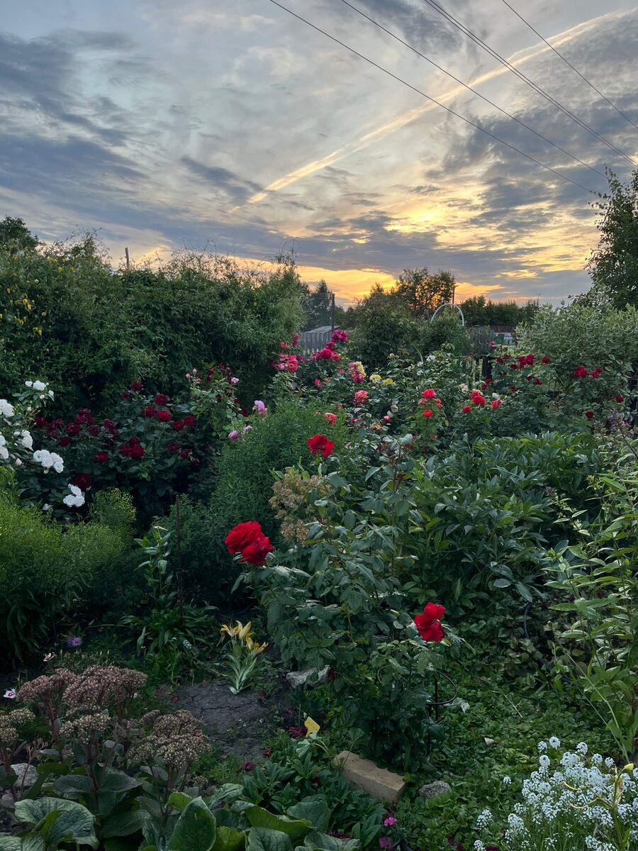 Загустела еще как, особенно это заметно в такое время суток. Солнце село, тишина, и лишь лягушки издают звуки где-то в этих зарослях. Лягушек особенно много в этом году, раньше никогда не слышала, как они разговаривают, а в этом году постоянно слышу. Поначалу не могла понять, что это за звуки. Маленький лягушонок на ладони у Нади. Вот здесь развязно ведут себя княжики. Когда их заводила, покупала семена по очень дорогой цене у нашей сибирской заводчицы, и столько много указаний и правил, как будто какой-то экзот из джунглей выращивается. Замачивание по часам, стратификация определенной температуры, проверять каждый день. И всё в этом роде. За 30 семян оплатила 300 руб., а потом удивилась, отчего же такая цена. Каждую осень этих пушистых шариков с семенами сотни, а в каждом столько же семян, и всходят они щеткой без какого-либо замачивания и стратификации. А уж сеянцы самих княжиков покупала по 650 руб., по цене клематисов или гортензий. Это было в самом начале моего увлечения всем, чег