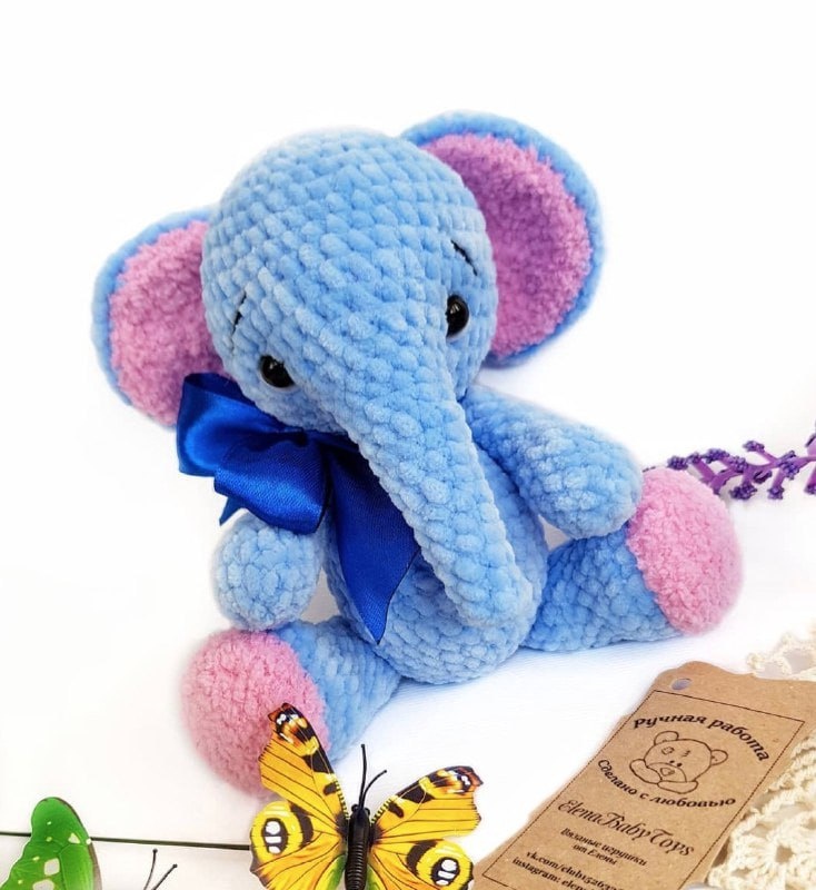 Материалы Голова и тело 1р. 6сбн в КА 2р. 6пр - 12 3р. (сбн, пр)*6 - 18 4р. (2сбн, пр)*6 - 24 5р. (3сбн, пр)*6 - 30 6р. (4сбн, пр)*6 - 36 7р. (5сбн, пр)*6 - 42 8-13р. 42сбн Между 12 и 13 рядами ставим маркеры для крепления глазок. Расстояние между глазками примерно 12сбн. Если глазки на безопасном крепление крепим их сейчас. Вырезаем кружки из фетра для белков, вставляем в них глазки и крепим. 14р. 16сбн, пропустить 10сбн, набрать 4вп, 16сбн - 36 15р. 2сбн, (уб, 4сбн)*5, уб, 2сбн - 30 16р. (3сбн, уб)*6 - 24 17р. (2сбн, уб)*6 - 18 18р. 18сс (если делать, сбн, то шея будет "болтаться" сс как бы усиливает шею и в следующий ряд вяжете не в них, а в предыдущий с захватом сс) 19-20р. 18сбн 21р. (2сбн, пр)*6 - 24 22р. 24сбн 23р. 14сбн, 6пр, 4сбн - 30 Прибавки должны находиться под нижней частью будущего хобота. Если произошло смещение, то вяжем 23 ряд с учётом смещения. 24р. 30сбн 25р. 14сбн, (пр, сбн)*6, 4сбн - 36 26-29р. 36сбн 30р. (4сбн, уб)*6 - 30 31р. (3сбн, уб)*6 - 24 32р. 24сбн 33р. (
