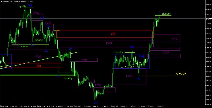 https://basechop.ru/wordpress/?p=51445 Техническая картина по эфиру не изменилась за последние сутки. Эфир продолжает сильное восходящее движение, и даже не думает корректироваться. Цена несколько дней подряд постояла на одном месте, но ощутимой коррекции мы так и не увидели. По состоянию на утро вторника, эфир снял ликвидность с последнего локального максимума, что является предупреждением о возможном падении криптовалюты. Однако напомним, что абсолютно любой сигнал не является сигналом о мощном движении в нужную сторону. Сигналы – это лишь предупреждение о том, что цена какое-то время может двигаться в определенном направлении. Таким образом, ожидать падения сейчас стоит, но оно может быть достаточно слабым. Да еще и на «бычьем» тренде… На дневном ТФ снизу остается огромное количество «бычьих» FVG, все – являются областями интереса POI для длинных позиций. Однако эфир пока не показывает ни малейшего желания корректироваться. Если цена не посещает области интереса, то и новые сделки…