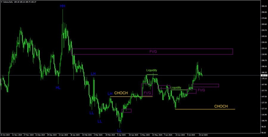 Солана за последние несколько дней довольно неплохо скорректировалась, однако только в рамках 4-часового ТФ. На 4-часовом ТФ солана даже весьма неплохо отработала последний «медвежий» FVG, а в данное время опустилась к «бычьему» FVG. Если реакция на него поступит, то сверху остается еще один «медвежий» FVG, от которого коррекционное падение может возобновиться. Однако «бычья» структура тренда сохраняется, поэтому ожидать по-прежнему нужно восходящее движение. Особенно в условиях, когда весь криптовалютный рынок растет. Какие-то криптовалюты сильнее, какие-то слабее, но рынок растет.