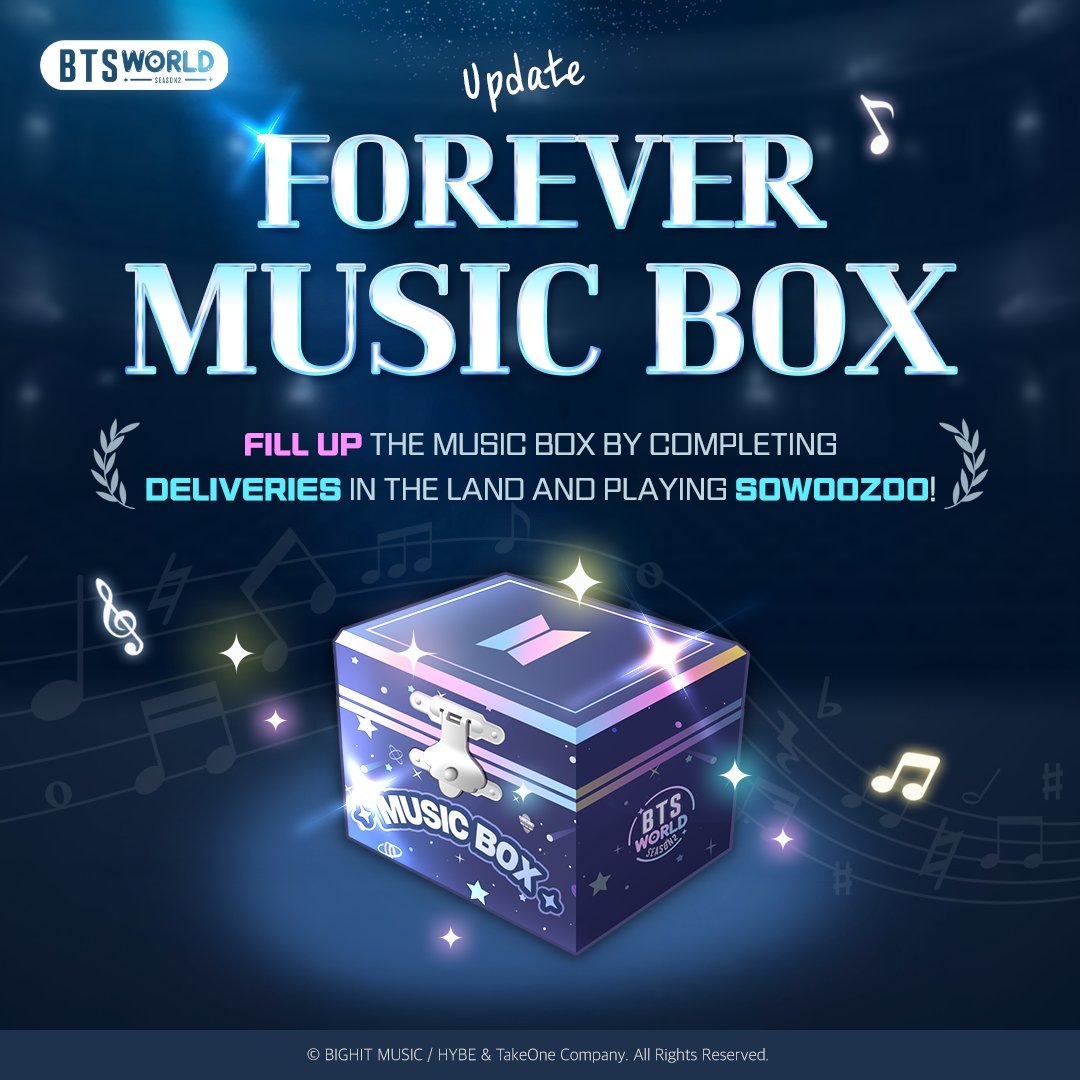 🍊 BTS World Season 2 в X: 🎼 Шкатулка вечной музыки: Сезон 3. Чем больше вы играете, тем крупнее награды — это особая коробка для Менеджеров! 💝 Наполняйте музыкальную шкатулку, участвуя в доставках на BTS Land и играя в Sowoozoo! 📅 Период события: до 05.08.2025 03:59 - Москва, Украина, Беларусь 05:59 - Казахстан, Узбекистан 📌 Подробности 🎮 Скачать игру #BTSWorld @kumihobts