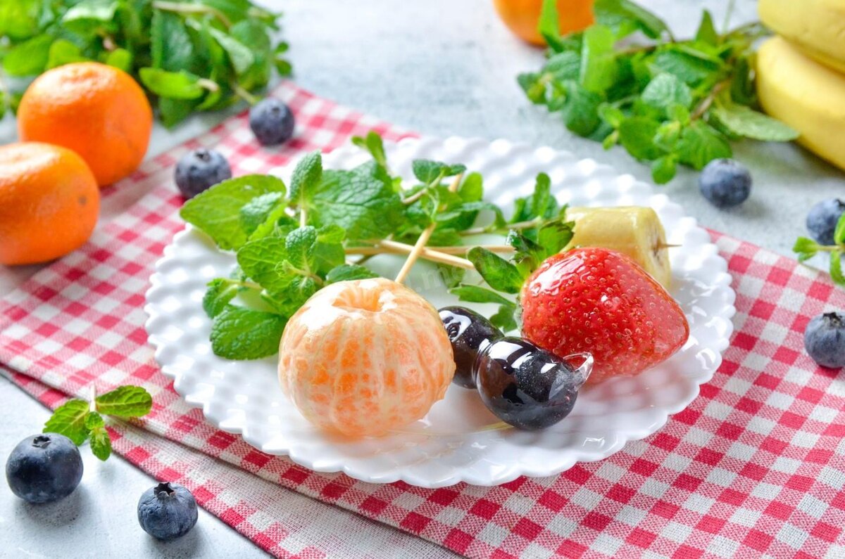 Сверкают и переливаются, невозможно отвести взгляд! Фрукты в стекле из сахара — десерт, который можно приготовить у себя на кухне. Главное следовать правилам, и все обязательно получится. Особенно будут рады дети, ведь так интересно и вкусно хрустеть прозрачной карамелькой. клубника 2 шт виноград 6 шт бананы 1 шт мандарины 2 шт Для карамели: сахар 200 гр вода 70 мл лимонный сок 1 чайн.л Шаг 1:Подготовьте продукты. Какие фрукты подходят для фруктовых композиций в стекле? Фрукты и ягоды подойдут практически любые. Главный критерий — они должны быть твердые, иначе в горячем сиропе потекут. И небольшого размера, чтобы не сваливались со шпажек. От себя добавлю, что предпочтительнее выбирать чуть кислые плоды, в сочетании с сахаром они будут более гармоничны. Шаг 2:Заранее поставьте высокий стакан с водой в морозилку минут на 10-15, вода должна хорошо охладиться. Ягоды и фрукты помойте и хорошо подсушите. Какие нужно очистите и нарежьте. Мандарины можете оставить целыми, а можете разделить н