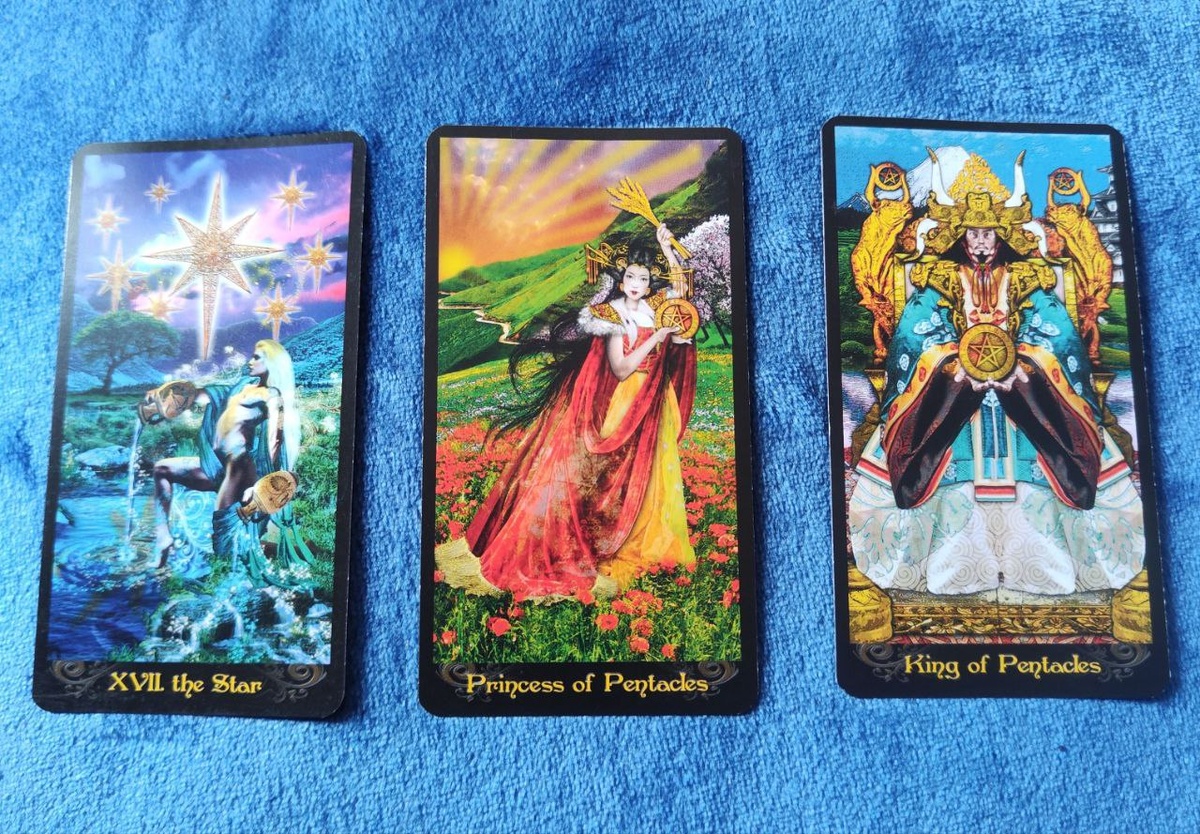 🌌✨ Дорогие друзья, сегодня нам предстоит удивительное путешествие в мир карт Таро Иллюминатов! Давайте внимательно рассмотрим три карты, которые станут нашими проводниками на этот день: Звезда, Паж Пентаклей и Король Пентаклей. Готовьтесь, будет интересно! 😉