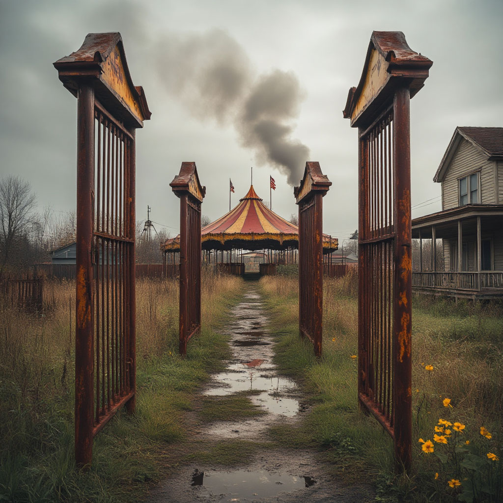 Старая вывеска «Весёлый мир» покосилась и едва держалась на ржавых креплениях. Когда-то яркие буквы теперь казались зловещими в свете заходящего солнца. Группа друзей решила исследовать заброшенный парк аттракционов, о котором ходили жуткие легенды.