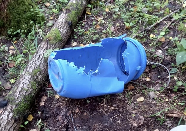При охоте на кабана с подхода на прикормочной площадке, хорошими помощниками являются фотоловушка (она оперативно передает информацию о происходящем у кормушки, см. статью «Фотоловушка») и кормушка, с которой кукуруза высыпается понемногу, кабан быстро не наедается, и поэтому надолго задерживается, давая охотнику время на приезд и скрадывание. И вот значит собрал я такую кормушку. Металлический штырь длиной больше метра, один конец острый, забивается в землю, на другом конце вращающееся крепление для троса. А на конце троса пластмассовая бочка литров на 40 с просверленными отверстиями. Задумка такая: кабан чует кукурузу в бочке, достать не может и начинает её толкать мордой, кукуруза высыпается из отверстий, и кабан её подбирает. А бочка катается вокруг вбитого в землю штыря. Идея вообще рабочая, знакомые охотники таким пользуются. Установил я кормушку в начале мая. Хотел заранее приучить кабанов к новому виду кормления. Фотоловушка стояла в другом месте. Пришел проверить через пару не