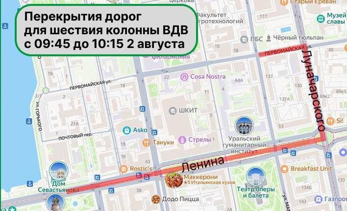 🪂 День ВДВ в Екатеринбурге: перекроют движение в центре 2 августа в Екатеринбурге отметят День ВДВ. В связи с шествием ветеранов в центре города будет временно ограничено движение транспорта. В какое время будет ограничено движение транспорта в Екатеринбурге? Читать → ПОДПИСАТЬСЯ 🔔 | Прислать новость @Odry77 #Екатеринбург #ДеньВДВ #ОграничениеДвижения 📷: Telegram канал «Интересный Екатеринбург»