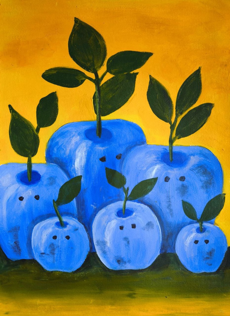Когда яблоки мечтают быть небом Эта работа родилась из вопроса: а что, если яблоко откажется быть красным или жёлтым? Я представила, что где-то в другом измерении растут синие яблоки — тихие, задумчивые, чуть-чуть удивлённые. Они словно наблюдают за нами, сохраняя внутреннюю тишину. Наивный стиль помогает подчеркнуть сказочность момента: это не просто натюрморт, а маленькая история. Семейство яблок — как люди, каждый со своим характером, со своей ролью в общем танце. Яблоки здесь — символ выбора: не вписываться в привычные цвета, остаться между, выбрать свой путь. Эта картина выполнена на художественной бумаге и доступна к продаже. Могу повторить картину на холсте в подходящем Вам размере. #картина #абстракция #женщина #голова #Картина_в_интерьер #картиныНины