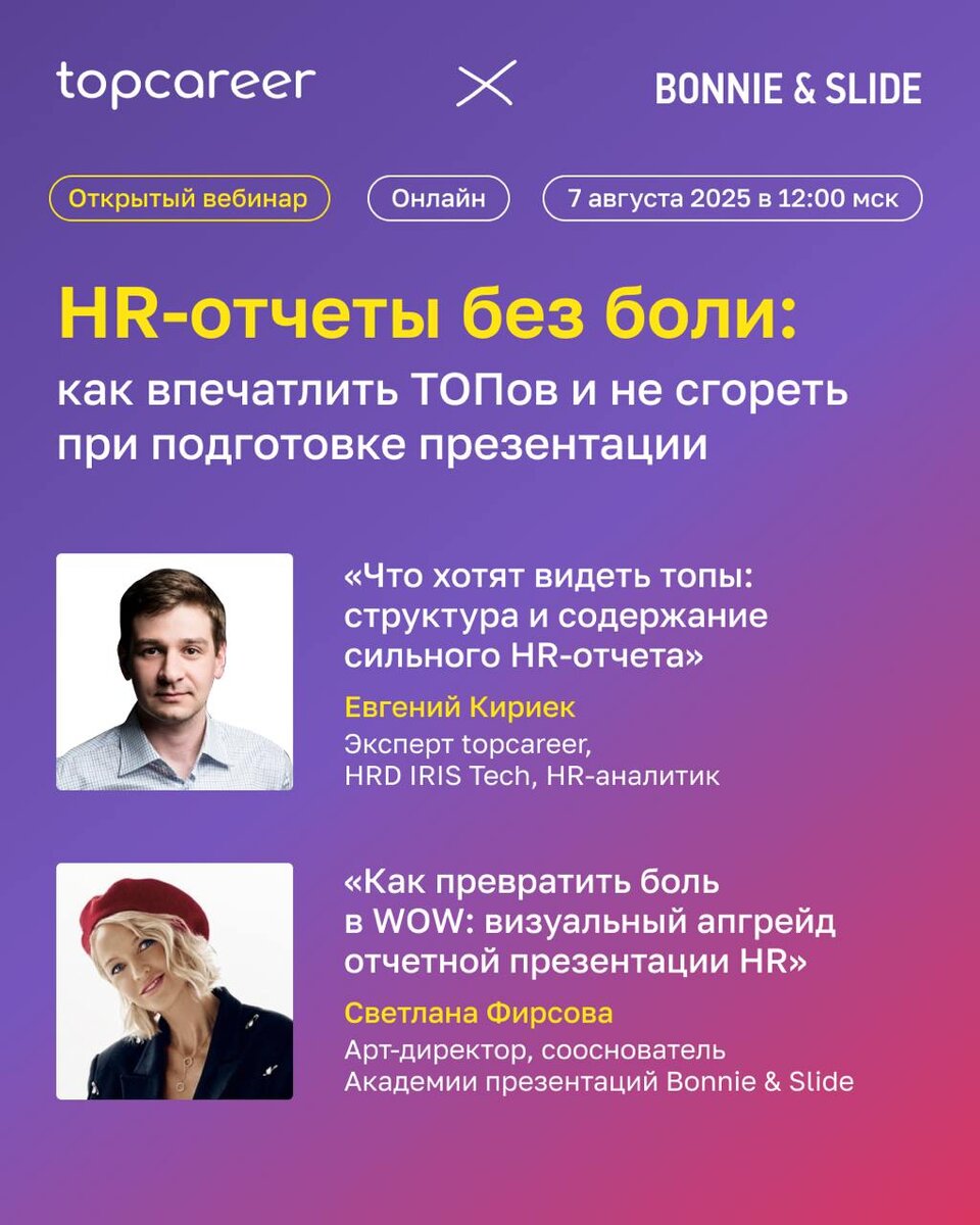 HR-отчёт, который ТОП-менеджеры действительно поймут и оценят Бывает так: вы часами собираете данные, формируете HR-отчёт, отправляете — и в ответ тишина. Ни обратной связи, ни реального интереса. А иногда и вовсе говорят: «А что с этим делать?» ➡️ Чтобы отчёты работали и помогали вам влиять на решения, приходите на совместный открытый вебинар от topcareer и Bonnie & Slide — школы дизайна и академии презентаций: HR-отчёты без боли: как впечатлить ТОПов и не сгореть при подготовке презентации 🗓 Когда: 7 августа в 12:00 (мск) Что разберём и покажем: 🟣 Чёткая структура, которую поймёт любой СЕО 🟣 Что показывать, а что оставить для себя 🟣 Как превратить скучные таблицы в классную презентацию (будет демонстрация «до/после») 🟣 Бонус: шаблоны, советы и визуальные лайфхаки Спикеры: 🟣 Евгений Кириёк, HRD в IRIS Tech, HR-Аналитик 🟣 Светлана Фирсова, Арт-директор и сооснователь Bonnie & Slide 💡 Будет полезно тем, кто готовит отчёты, защищает предложения перед руководством и хочет,