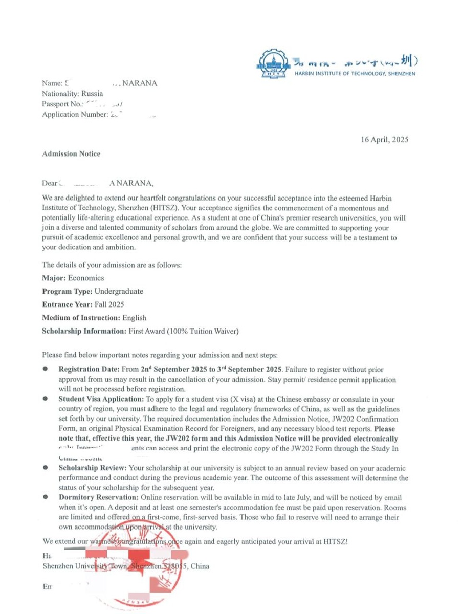 #подтверждениегранта для Нараны, и снова подтверждениЯ 🎓 Бакалавриат на английском в 1.Harbin Institute of Technology (Shenzhen/Шэньчжэнь) , специальность "экономика" 🍀 Грант университета, покрывает обучение 2. Shenzhen University (Shenzhen/Шэньчжэнь), специальность "бизнес администрирование" 🍀 Грант университета, с покрытием 50% стоимости обучения 💼 Нарана сдала Duolingo на 105 баллов, поступала после 11 класса, хотела только Шэньчжэнь или Шанхай☺️ 👍Поздравляем Нарану с хорошим результатом 🎉 и выражаем благодарность за доверие и сотрудничество с нами🙏🏻 Не жалейте 👍🏻 в поддержку наших абитуриентов 🍀 Мы УЖЕ принимаем в работу на гранты 2026, места ограниченны 🔴 Для оценки потенциала заполняйте АНКЕТУ 📋 УСЛУГИ и ТАРИФЫ 🔗 САЙТ