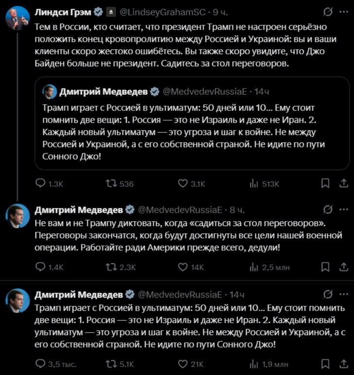 Заявление Медведева от 22 июня о том, что «Ряд стран готовы напрямую поставлять Ирану собственные ядерные боеголовки», комментировал сам Трамп.