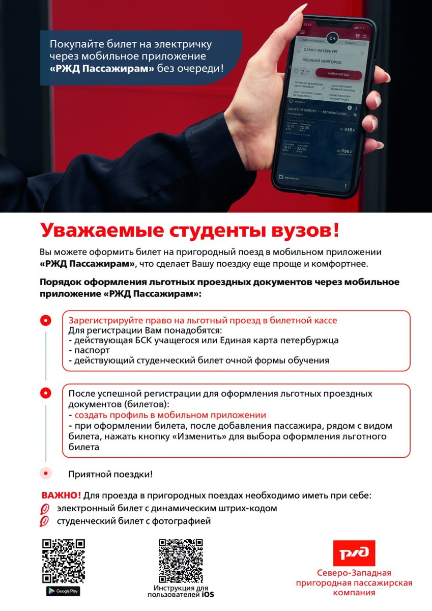 🚉 Путешествовать по пригородам Санкт-Петербурга стало удобнее и выгоднее! Студенты очной формы обучения могут оформить льготные билеты на пригородные поезда прямо в мобильном приложении «РЖД Пассажирам». Льгота доступна для обучающихся по программам бакалавриата, специалитета и магистратуры в вузах Санкт-Петербурга. Каникулы — отличное время, чтобы навестить родных или открыть новые места рядом с городом!