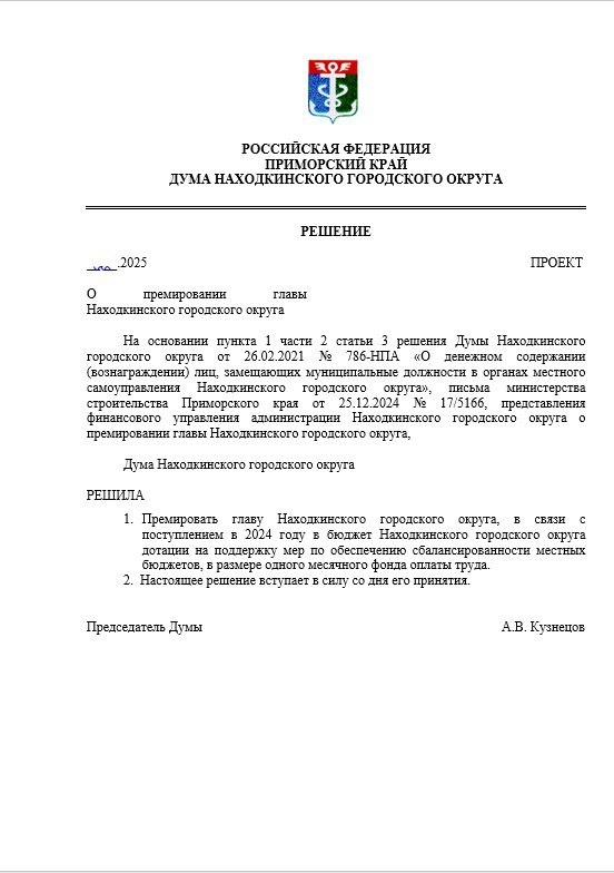 Мэр Находки Тимур Магинский может получить премию. На сайте городской думы появился соответствующий проект решения. 30 июля на очередном заседании думы Находкинского городского округа депутаты примут решение о премировании главы города. «Премировать главу Находкинского городского округа, в связи с поступлением в 2024 году в бюджет Находкинского городского округа дотации на поддержку мер по обеспечению сбалансированности местных бюджетов, в размере одного месячного фонда оплаты труда», — говорится в документе. Корреспондент VLADIVOSTOK1.RU обратился в думу Находки, однако там затруднились ответить, о какой именно сумме идет речь. Фото: duma-nakhodka.ru 🔲Подписаться | Предложить новость
