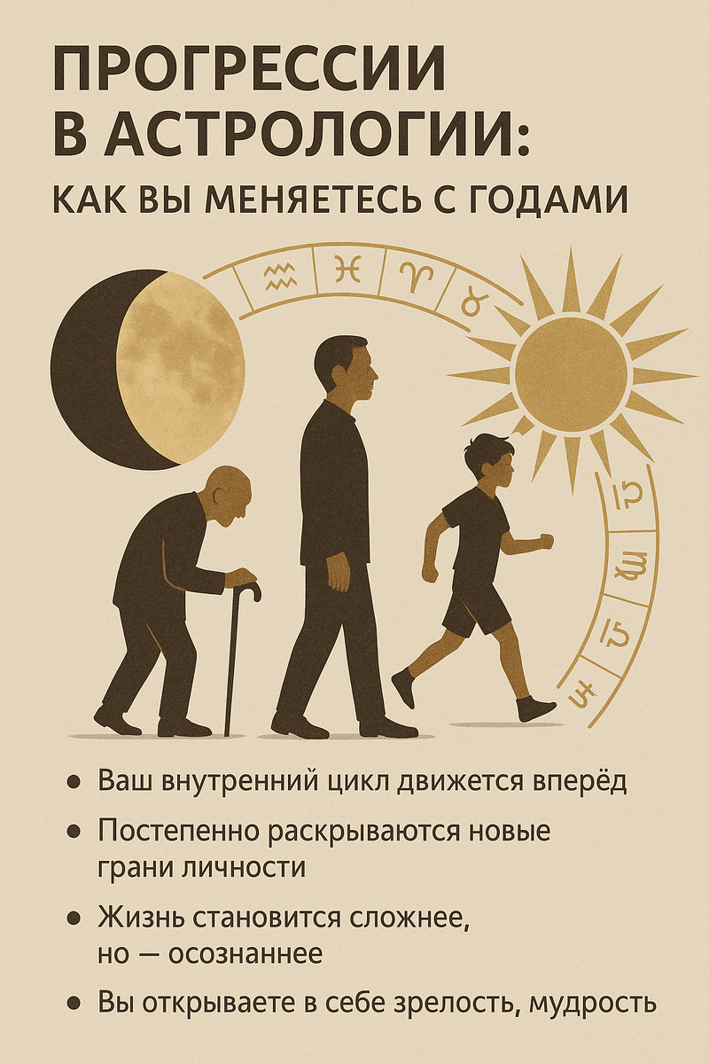 Многие думают, что астрология — это только про натальную карту и знак зодиака. Но она умеет гораздо больше. Один из самых точных инструментов прогноза и самопознания — вторичные прогрессии. Они показывают, как вы внутренне меняетесь с годами, через какие стадии проходите и в чём именно растёте. Вторичная прогрессия — это метод, при котором один день после рождения = один год жизни. Например, что происходило на 25-й день после вашего рождения — отражает, каким был ваш 25-й год. Это звучит абстрактно, но на практике работает удивительно точно. Прогрессии показывают не внешние события, а внутренние изменения: как вы себя ощущаете, какие темы становятся важными, что вас вдохновляет или тревожит. Прогрессивная Луна движется по знакам и домам, и именно она задаёт тон ваших переживаний на 2–2,5 года. Примеры: По движению Луны можно понять, к чему вы эмоционально готовы и что нужно душе сейчас. Когда прогрессивное Солнце переходит в другой знак (примерно раз в 30 лет), это смена жизненной пара