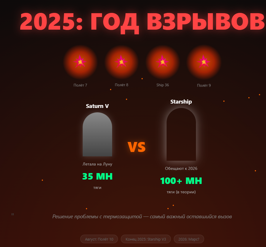 Starship Маска взорвался 4 раза подряд в 2025 году. Но он обещает сделать ракету в 3 раза мощнее той, что летала на Луну