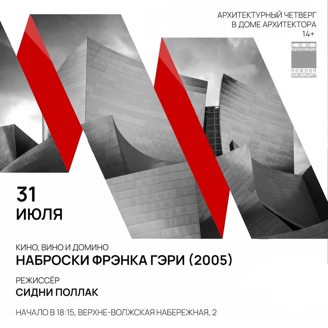 АРХЧЕТВЕРГ В четверг, 31 июля, документальный фильм Сидни Поллака «НАБРОСКИ ФРЭНКА ГЭРИ»! На протяжении всего фильма с архитектором беседует сам режиссёр, которого он попросил снять о себе картину. О нём здесь говорят друзья, художники, критики и кураторы. Сам же Фрэнк Гэри рассказывает о том, как в детстве играл с бабушкой в чурки, строя из них города и дороги, рисовал с отцом, ходил на лекции Алвара Аалто, осваивал компьютер, ходил к психоаналитику, экспериментировал со своим домом, привносил в архитектуру живопись и… мусорную корзину и многое-многое другое. Фильм будет демонстрироваться на языке оригинала с субтитрами. ❗️Вход свободный. Необходима предварительная регистрация ❗️ 🏛 Верхне-Волжская набережная, дом 2 😄 Мероприятия Нижний Новгород. Я местный! 🔝 Розыгрыш 8 билетов на концерт Дельфина