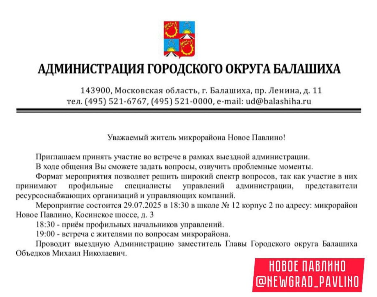 📌Уважаемые соседи! Сегодня запланирована встреча в формате «выездной администрации», где администрация ответит на вопросы жителей. ✅Место проведения – г. Балашиха, мкр. Новое Павлино, Косинское шоссе, д. 3 (школа № 12 корпус 2). ⏱️18:30 - приём профильных начальников управлений. ⏱️19:00 - встреча с жителями по вопросам микрорайона. НОВОЕ ПАВЛИНО Прислать новость|Подписаться🎈