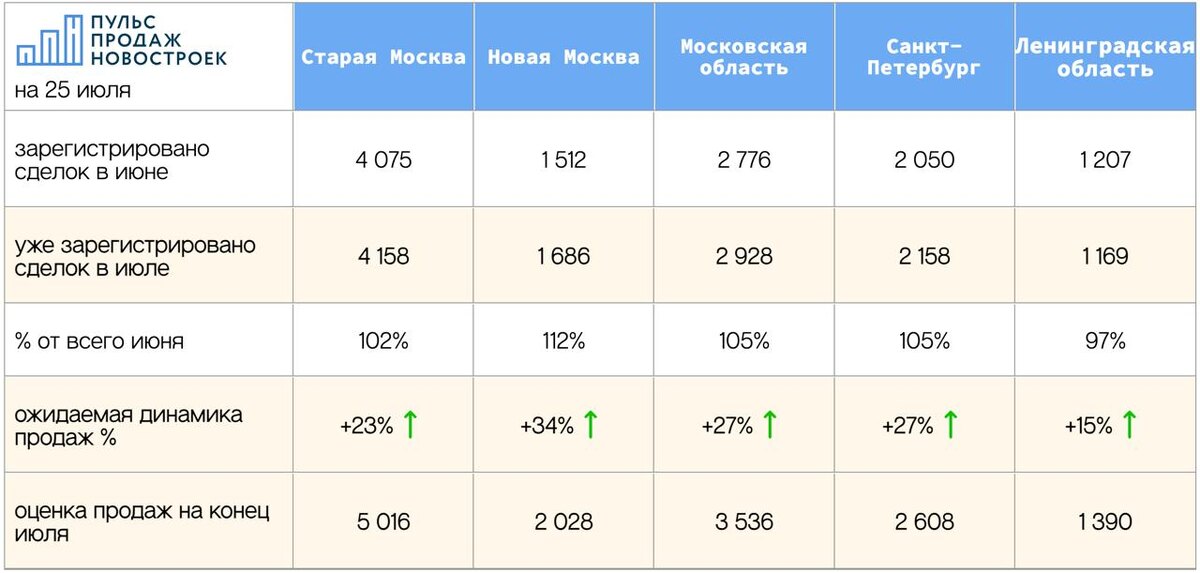 29 июля, а значит мы уже знаем, сколько сделок с жильем было зарегистрировано. 📈 Данные в таблице. Детально: 🔼Старая Москва: уже прошло регистрацию порядка 4 158 сделок по итогам июля, прогноз +23% (5 016 ДДУ за июль) 🔼Новая Москва: 1686 сделок сделок, прогноз +34% 🔼Московская область: 2928 сделок сделок, прогноз +27% 🔼Санкт-Петербург: 2158 сделок сделок, прогноз +27% 🔼Ленинградская область: 1169 сделок сделок, прогноз +15% 🔥 @pulsprodaj