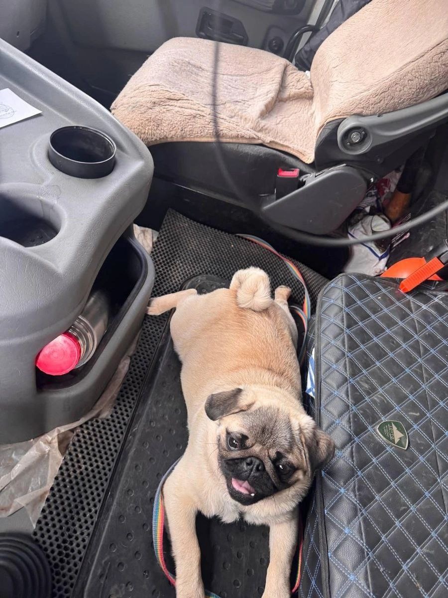 🐶 Иван отвязал песика и забрал с собой. В кабине мусоровоза мопс быстро освоился и даже потеснил на сиденье помощника Ивана.
