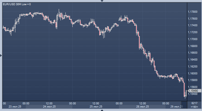 Евро испытывает трудности после падения на 1,3% в понедельник. Торговое соглашение между США и ЕС подверглось критике со стороны некоторых лидеров еврозоны. Доллар укрепляется, внимание сосредоточено на ФРС и Банке Японии График евро/доллара интервалами в 30 минут Во вторник евро с трудом восстанавливал свои потери, поскольку инвесторы осознали, что условия торгового соглашения между США и Евросоюзом были выгодны для США и вряд ли улучшили экономические перспективы блока. В понедельник Франция назвала рамочное торговое соглашение «чёрным днём» для Европы, заявив, что блок уступил президенту США Дональду Трампу, заключив несбалансированную сделку, которая повлекла за собой введение 15%-ных пошлин на товары ЕС. Канцлер Германии Фридрих Мерц заявил, что его экономика понесёт «значительный» ущерб из-за согласованных пошлин. Евро упал на 1,3% на предыдущей сессии, что стало самым резким однодневным процентным падением за последние два месяца, на фоне опасений по поводу экономического роста
