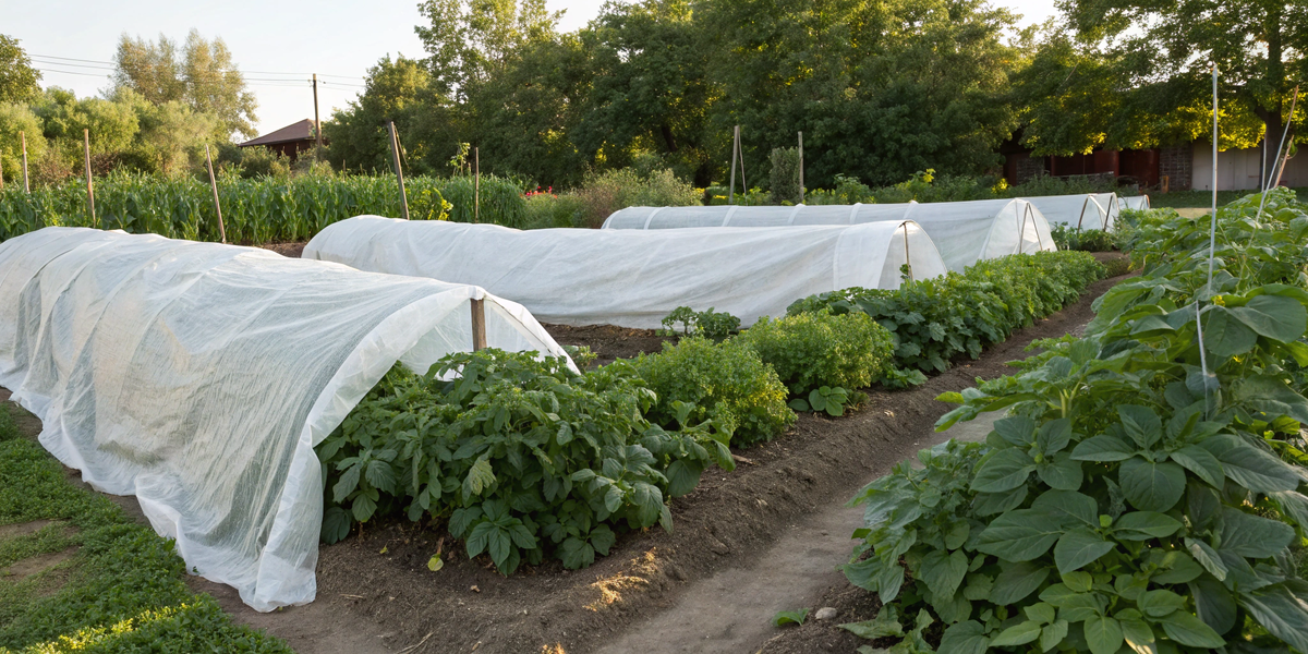 - Использование укрывных материалов. Установите над растениями дуги, а сверху натяните спанбонд или другой нетканый материал. Делать это нужно днём, чтобы воздух под укрытием прогрелся на солнце. Вечером можно добавить слой полиэтилена, клеёнки или ткань, усиливая защиту. Укрывной материал защищает посадки от резких перепадов температуры и поддерживает микроклимат.
