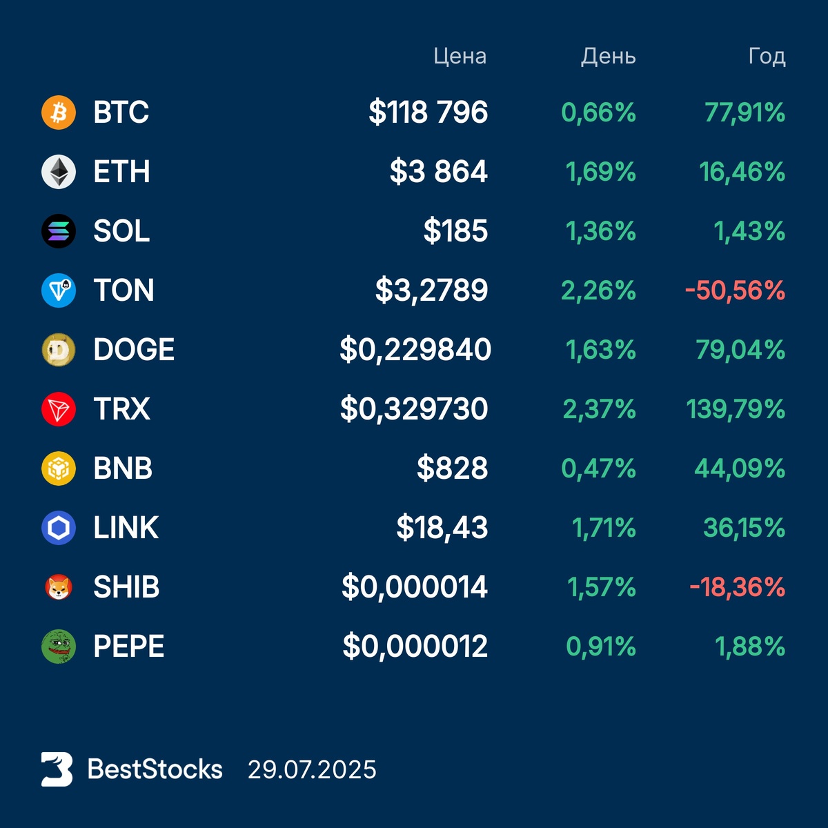Курсы основных криптовалют: Bitcoin, Etherium, Solana, Toncoin, Dogecoin, TRON, BNB, Chainlink, Pepe, Shiba Inu на текущий момент #крипта #crypto #курс #BTC #ETH #SOL #TON #DOGE #TRX #BNB #LINKUSD #PEPEUSD #SHIBUSD ••••• 🔥 Получайте более 400 свежих прогнозов по акциям каждый день. Выбирайте самый высокий потенциал, рейтинг аналитика, срок прогноза и биржу, где торгуется акция.