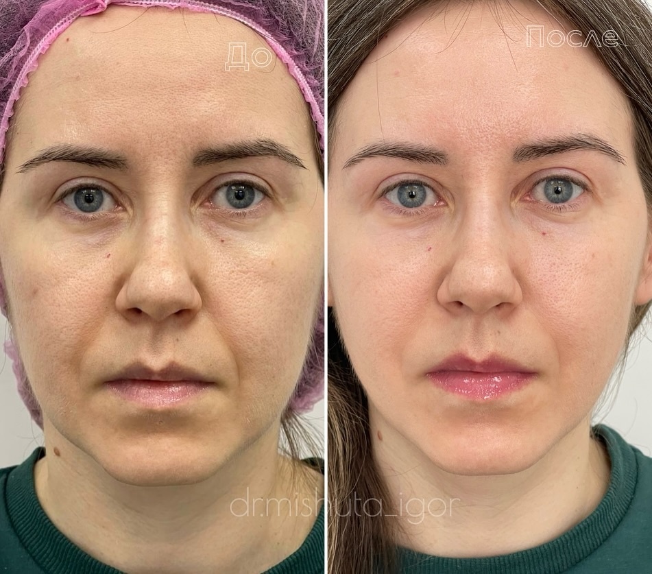 Результат ультразвукового СМАС-лифтинга. Как вам? Обратите внимание, насколько хорошо произошло сглаживание рельефа средней трети лица: малярные мешки, слезные борозды. А также заметно улучшилось качество кожи, она стала более плотная и упругая, что также очевидно на фото.