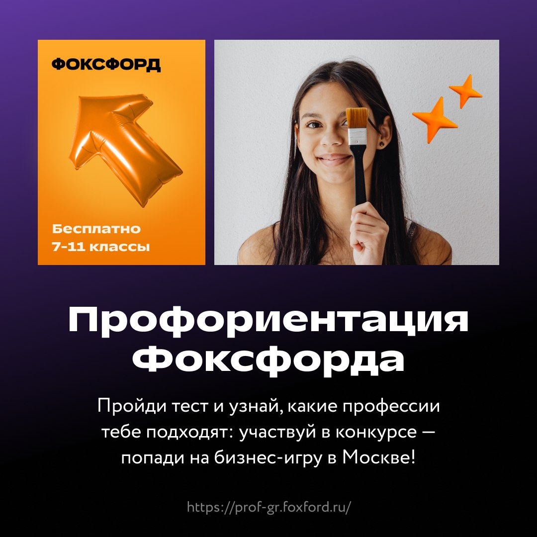 Узнайте, какая профессия вам подойдёт, и поучаствуйте в конкурсе! Онлайн-школа «Фоксфорд» подготовила тест на профориентацию для дошкольников и учащихся 1–11-х классов. Пройдите его и узнайте, кем вы можете стать в будущем, какие у вас сильные стороны и как их развивать: prof-gr.foxford.ru/ Учащиеся 7–11-х классов могут участвовать в конкурсе — финалисты попадут в список одарённых детей, получат призы и приглашение на бизнес-игру в офисе Фоксфорда в Москве. Как принять участие? - Пройти тест. - Подготовить видеовизитку на одну из тем: «Профессия, которой пока не существует, но она нужна миру» или «Моё хобби — путь к профессии». В первом случае придумайте новую специальность и опишите её, а во втором — расскажите, как любимое занятие может стать делом всей жизни. Длительность ролика — до 5 минут. - Отправить видео в телеграм-бот до 5 августа текущего года включительно: t.me/foxford_ege_bot?start=profcland Жюри выберет 30 лучших работ и 15 августа 2025 года объявит финалистов.