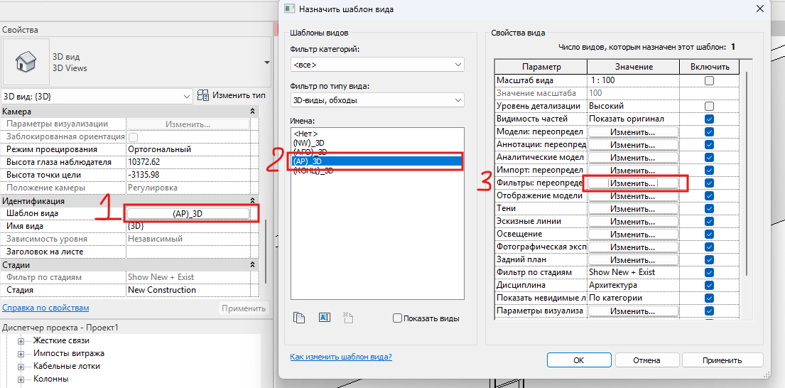 Скрытие элементов в шаблоне вида, перекрашивание элементов на виде, изменение штриховки - все это возможно сделать инструментом - Фильтр. Так как я работаю через шаблоны видов, то будем использовать фильтры применительно к шаблонам видов. Замоделируем элементы у нас на виде, например стул, лестницу, отверстие и стену. В нашем случае мы хотим покрасить стул и лестницу в зеленый цвет на всех планах, где задан шаблон вида "(АР)_3Д". Для назначения виду фильтра необходимо перейти в "Шаблон вида"(1) - Посмотреть, что у нас выбран корректный шаблон(2) - и нажать на фильтры(3) Жмем "Добавить"(1) - "Изменить/создать"(2) - "Создать"(3) - Задаем узнаваемое имя (4) - "Ок"(5) Далее выбираем, с какими категориями семейств будем работать (1), выбираем, какая логика будет работать в фильтре (2). Часто, логика "ИЛИ"(2) (как в Excel "or"). То есть, Revit смотрит на наши правила и анализирует каждый элемент в модели и проверяет по правилам (4). В нашем случае, Revit проверяет, или параметр "Имя Сем