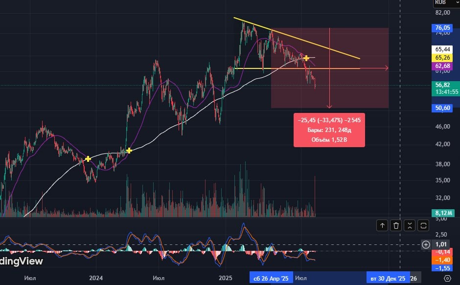 $AFLT Предыдущий разбор тут https://dzen.ru/media/tradinvesti/aflt-6874c12e43a13343294c5dc0 все как я и пророчила. 😆 Честно говоря я немного в афиге, что произошло именно так как я написала, кто бы мог знать что у них начнутся проблемы с хакерами. ✅Фигуру пока до конца не отработали, поэтому есть шанс ещё опуститься ниже до 50,7. ✔️Кстати, Вот в этом разборе я писала про начало корркции https://dzen.ru/media/tradinvesti/aflt-68341fc50e27bf207cc402a3. Вот это я молодец 😂😂 Быстро накидали лайков пророку всея мосбиржа 😂 НЕ ИИР