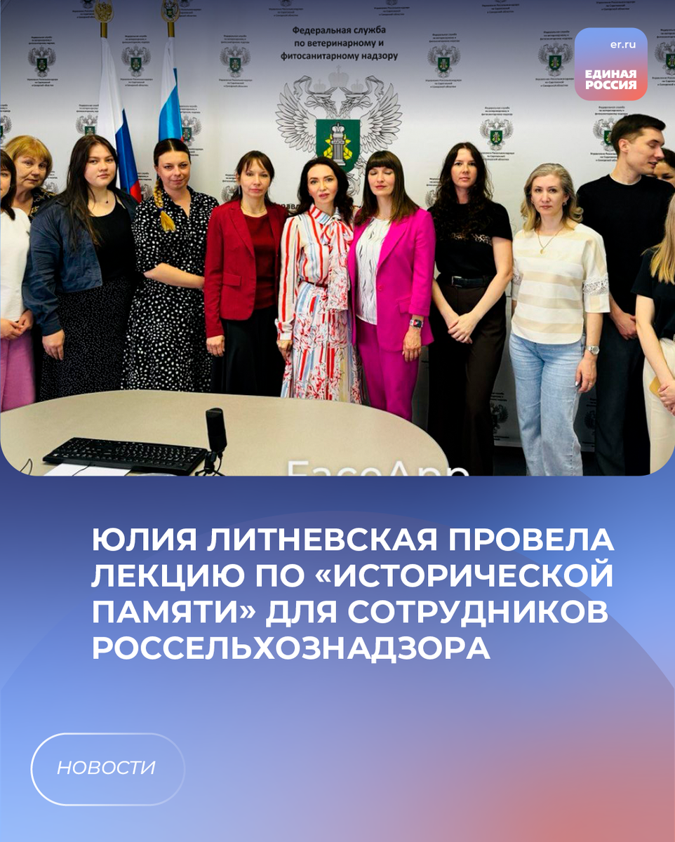 🗣По инициативе федерального просветительского проекта Российского общества «Знание и Государство», в рамках направления народной программы партии «Единая Россия» «Культура, история, традиции» председатель комитета Саратовской областной Думы по образованию и культуре, координатор проекта «Историческая память» партии «Единая Россия» Юлия Литневская провела лекцию для сотрудников Россельхознадзора.