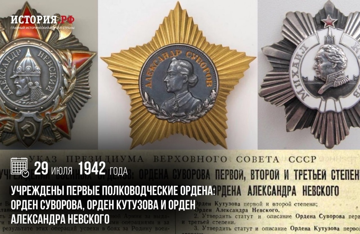 29 июля 1942 г. Учреждены первые полководческие ордена: орден Суворова, орден Кутузова и орден Александра Невского. До этого времени у нас в стране и рядовые, и высший командный состав получали одни и те же ордена. От этих традиций решили отойти и посчитали, что новые ордена должны вручаться в соответствии с должностью. Первыми награжденными стали высшие советские военачальники. В октябре 1943 года появился еще один орден — Богдана Хмельницкого. А в марте 1944 года были учреждены награды для военных моряков — ордена Ушакова и Нахимова #ПамятныеДатыВоеннойИсторииОтечества #ДеньВИстории #ГодЗащитникаОтечества #80ЛетВеликойПобеды Источник: https://vk.com/wall-216215303_2136 Подпишитесь на наши группы ВКонтакте, в Одноклассниках, в Телеграм - читайте, смотрите и комментируйте информационные материалы, предлагайте свои! Источник
