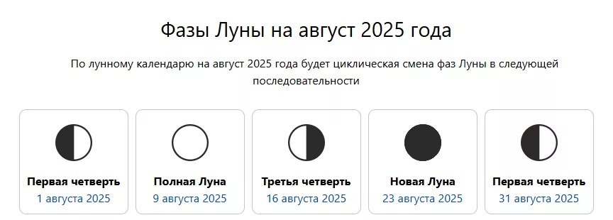 Лунные календари на август 2025 года: Узнайте, какие дни будут благоприятными для разных дел в августе! 🔹 🌗 Лунный календарь на август 2025 года — Полезная информация о фазах Луны и их влиянии на вашу повседневную жизнь: Подробнее (https://mirkosmosa.ru/lunar-calendar/phase-moon/2025/august) 🔹 ✂ Лунный календарь стрижек на август 2025 года — Когда лучше стричь волосы для здоровья и красоты? Подробнее (https://mirkosmosa.ru/lunar-calendar/haircut/2025/august) 🔹 🌱 Лунный календарь огородника и садовода на август 2025 года — Благоприятные дни для посевов, посадок и других садовых работ! Подробнее (https://mirkosmosa.ru/lunar-calendar/garden/2025/august) 🔹 📅 Лунный календарь дел на август 2025 года — Удачные дни для решения важных задач и начинаний. Подробнее (https://mirkosmosa.ru/lunar-calendar/work/2025/august) 🔹 💍 Лунный календарь свадеб на август 2025 года — Выберите день для вашего идеального торжества. Подробнее (https://mirkosmosa.ru/lunar-calendar/wedding/2025/augus