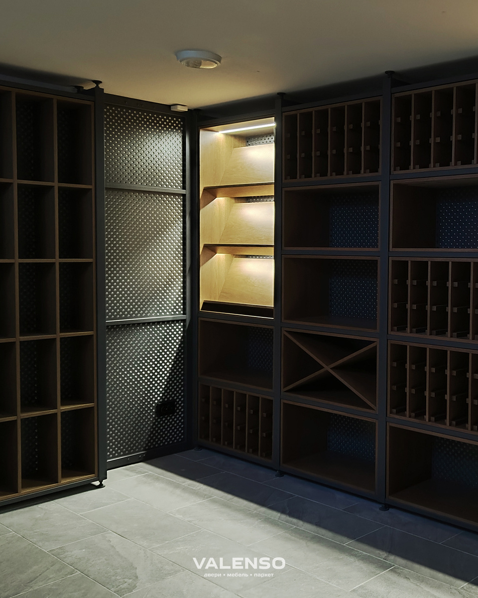 В финальном посте о винном погребе хотим уделить внимание освещению — а именно, декоративной подсветке. Несмотря на то что это не жилое помещение, а зона хранения, здесь реализованы продуманные элементы визуального комфорта. На некоторых полках встроена деликатная подсветка, её видно в секциях с наклонным хранением бутылок. Источник света размещён таким образом, чтобы не слепить и не создавать прямого излучения в глаза, а лишь мягко подчеркивать форму и глубину композиции. Таким образом, в помещении предусмотрены два световых сценария: общее освещение — для полной видимости, и декоративная подсветка — для создания особой атмосферы. Автор интерьера: Татьяна Протасова.
