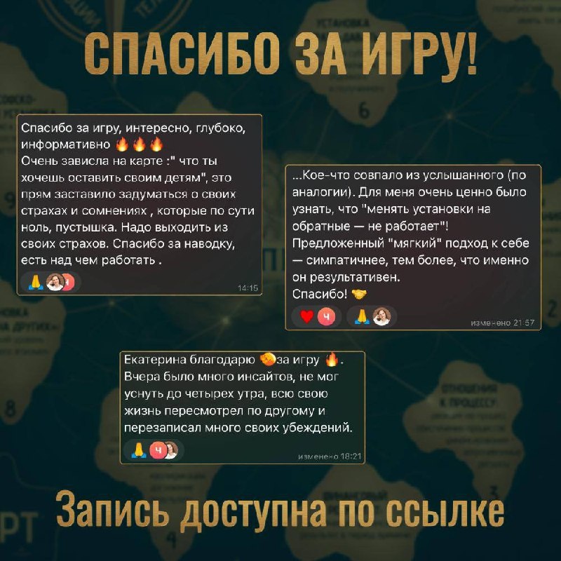 Запись игры «Код Перемен» — уже доступна! 🎉 Огромное спасибо каждому, кто был с нами на первой игре «Код Перемен»! Это было мощно, глубоко и вдохновляюще — настоящий старт с огнём! 🔥 Мы чувствуем вашу энергию и благодарны за активность, открытость и искреннее участие. Для тех, кто не успел присоединиться в прямом эфире - у нас отличная новость: 📹 Запись первой игры уже готова! Рекомендуем: не включайте её фоном ❗️ Это не просто видео - это процесс. Уделите себе время, создайте пространство и по-настоящему поиграйте вместе с нами. Желаем мощных инсайтов и мягких, но решительных перемен. Продолжение уже скоро — следите за анонсами! 💫 ➡️ СМОТРЕТЬ ЗАПИСЬ