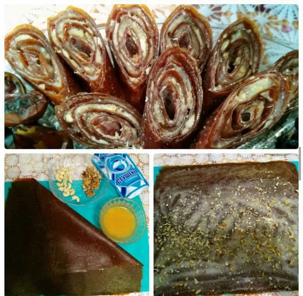 Кактан рулет. Какка башта бал, аннары аз гына ак сгущенка җәябез. Мин эченә Әстерхан һәм Кешью чикләвекләрен угычтан чыгарып сиптем. Һәркем үзенчә эшли. Какны рулет формасында тыгызлап төреп, бәйләп куясы, кичкә суыткычта калдырасы. Табынга тәгәрмәчләп кисеп, өстенә сгущенка агызып бирергә була. фото: Мәрьям Миңнегулова рецепт: Рафилә Шәмсетдинова