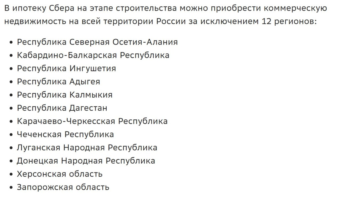 Сбербанк возобновил выдачу ипотеку на коммерческую недвижимость в рамках программ по приобретению готового и строящегося жилья. К сожалению, Осетия в списке 12 регионов, где эта программа работать не будет. Программа в себя включает: ✅Сумма кредита 500 тыс. рублей — 100 млн рублей ✅Первоначальный взнос — 30,1%. ✅Срок кредита от 1 года до 25 лет. При этом ипотеку на коммерческую недвижимость могут взять заемщики — физические лица. Помещение должно находиться в многоквартирном доме на этаже от -1 до 2. Максимальная площадь — 350 кв. метров. Программа по приобретению строящегося коммерческого объекта распространяется практически на всю РФ, за исключением перечня из 12 регионов, куда входит Республика Северная Осетия-Алания. Комментарий @OssetiaFB: «Не совсем понятна причина, по которой Осетия попала в список регионов-изгоев для Сбербанка? В Осетии сейчас реализуются масштабные строительные проекты, каждый год сдается по 400-450 тыс. квадратных метров жилья, и практически во всех нов