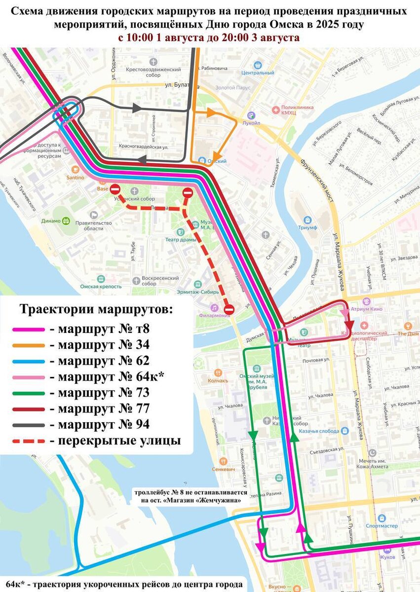 Из-за подготовки и празднования Дня города и Омской области с 1 по 3 августа будут изменены схемы движения общественного транспорта в центре областной столицы. Так, с 10:00 1 августа до 20:00 3 августа из-за закрытия движения по улице Ленина на участке от улицы Интернациональной до улицы Партизанской, включая Соборную площадь, по улице Герцена на участке от улицы Интернациональной до улицы Ленина, включая площадь Победы: С 6:00 до 24:00 2 августа из-за закрытия движения по улице Ленина на участке от улицы Партизанской до улицы Лермонтова, включая Юбилейный мост: Также с 6:00 до 14:00 2 августа из-за закрытия движения по улице Ленина на участке от улицы Лермонтова до Ленинградской площади, по улице Шаумяна на участке от улицы 9-й Ленинской до улицы 12-й Пролетарской: В мэрии попросили омичей внимательно ознакомиться с изменёнными схемами движения маршрутов.