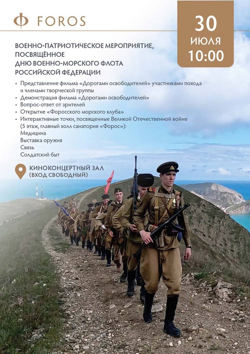 π·πΊ 30 ΠΈΡΠ»Ρ Π² 10:00 Π² ΠΊΠΈΠ½ΠΎΠΊΠΎΠ½ΡΠ΅ΡΡΠ½ΠΎΠΌ Π·Π°Π»Π΅ ΡΠ°Π½Π°ΡΠΎΡΠΈΡ Β«Π€ΠΎΡΠΎΡΒ» ΡΠΎΡΡΠΎΠΈΡΡΡ Π²ΠΎΠ΅Π½Π½ΠΎ-ΠΏΠ°ΡΡΠΈΠΎΡΠΈΡΠ΅ΡΠΊΠΎΠ΅ ΠΌΠ΅ΡΠΎΠΏΡΠΈΡΡΠΈΠ΅, ΠΏΡΠΈΡΡΠΎΡΠ΅Π½Π½ΠΎΠ΅ ΠΊΠΎ ΠΠ½Ρ ΠΠΎΠ΅Π½Π½ΠΎ-ΠΠΎΡΡΠΊΠΎΠ³ΠΎ Π€Π»ΠΎΡΠ° Π ΠΎΡΡΠΈΠΉΡΠΊΠΎΠΉ Π€Π΅Π΄Π΅ΡΠ°ΡΠΈΠΈ. πͺ Π ΠΏΡΠΎΠ³ΡΠ°ΠΌΠΌΠ΅: β ΠΡΠ΅Π·Π΅Π½ΡΠ°ΡΠΈΡ ΡΠΈΠ»ΡΠΌΠ° Β«ΠΠΎΡΠΎΠ³Π°ΠΌΠΈ ΠΎΡΠ²ΠΎΠ±ΠΎΠ΄ΠΈΡΠ΅Π»Π΅ΠΉΒ» Ρ ΡΡΠ°ΡΡΠΈΠ΅ΠΌ ΡΡΠ°ΡΡΠ½ΠΈΠΊΠΎΠ² ΠΏΠΎΡ