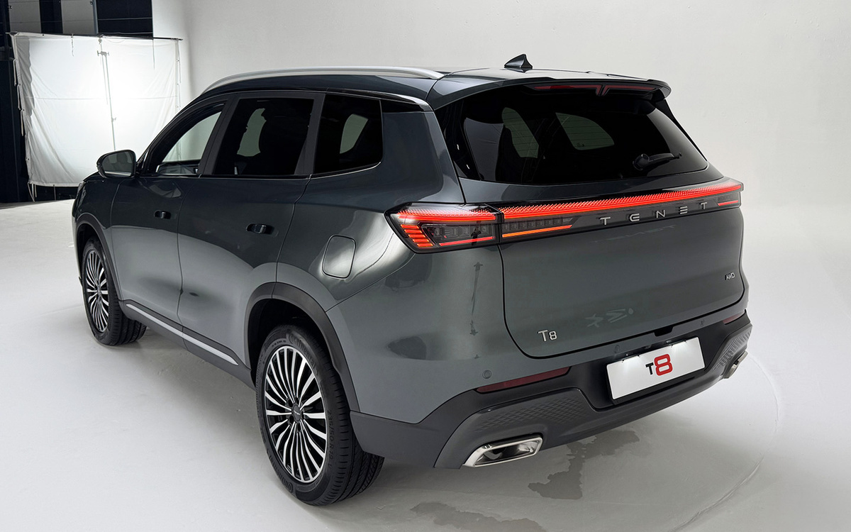 Сзади Tenet T8 выполнен в соответствии с современными модными тенденциями: фонари объединены единой световой полосой, что выглядит стильно. Под этой полосой, на стеклянной или пластиковой части, размещена надпись "TENET", состоящая из отдельных букв, приклеенных к поверхности. Отмечается, что каждая перекладинка в букве "Е" также приклеена отдельно, что может потребовать осторожности при мойке автомобиля, а также вызывает вопросы о долговечности крепления, так как на презентационной модели некоторые буквы уже имели признаки отклеивания, возможно, будучи посаженными на двусторонний скотч.